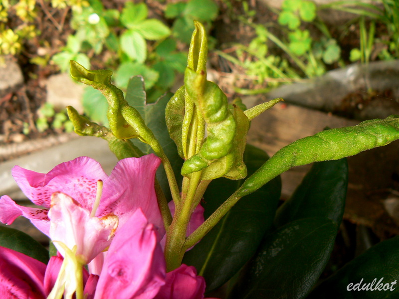 Anko... gdyby Twój rodek zawiązywał pączki a one by usychały zanim nabrałyby kolorów, to można byłoby podejrzewać jakieś grzyby czy cóś... ale takie opadanie pąków na ostatniej prostej, tuż, tuż przed kwitnieniem też mi się niestety wydaje efektem zbyt małego nawodnienia krzewu. Twój rodek to zapewne 'Catawbiense Grandiflorum' lub któryś mu pokrewny... to generalnie mocarne rodki, wiele znoszące... a w związku z tym zastanawia mnie stanowisko, w którym rośnie i najbliższe sąsiedztwo, zwłaszcza drzew... być może ich korzenie zabierają mu i wodę i składniki pokarmowe, konieczne do kwitnienia... przybliżysz, jak to z tym jest? I który to sezon rośnie w Twoim ogrodzie?