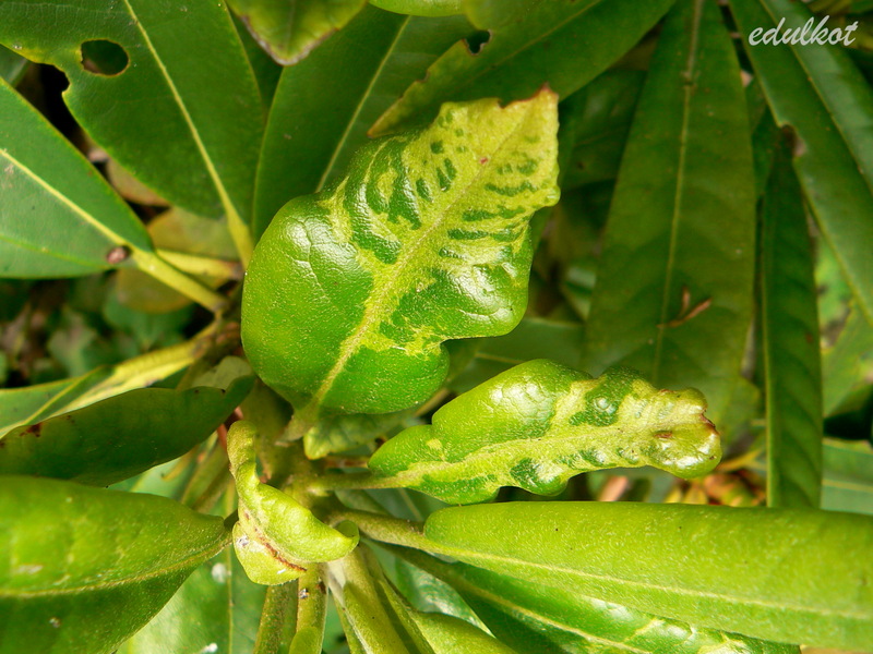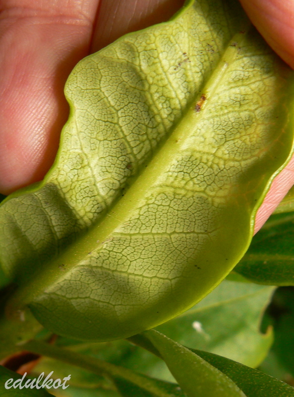 Rodka Asi zaatakował grzyb, ale ja jestem nazbyt zielony laik w tych sprawach, by próbować identyfikacji... biały nalot sugerowałby mączniaka, jednak nigdzie nie spotkałam się z info, że łapie różaneczniki, bo azalie to i owszem. Proponowałam Asi, gdy się spotkałyśmy, by nawiązała kontakt z Katarzyną, która jest specem fito i bada pod mikroskopem grzyby wszelakie... bo ja cóż... zalecić tylko Polyversum mogę, ale czy to jest remedium na wszystkie choroby grzybowe rodków :nie_wiem