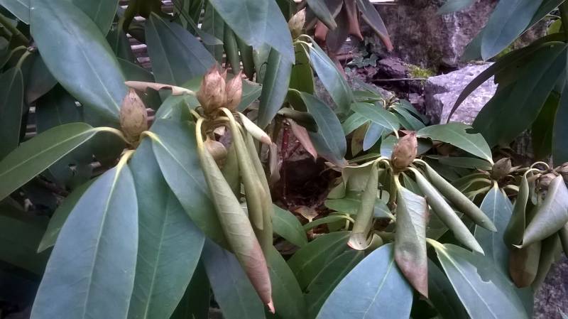Tomku, rododendron u siostry ma albo za mało kwaśną ziemię, albo jest przenawożony, albo jedno i drugie. Widać na liściach, które jeszcze nie zżółkły, objawy chlorozy ( zielone żyłki nerwów na jasnym liściu, potem liść robi się żółty).