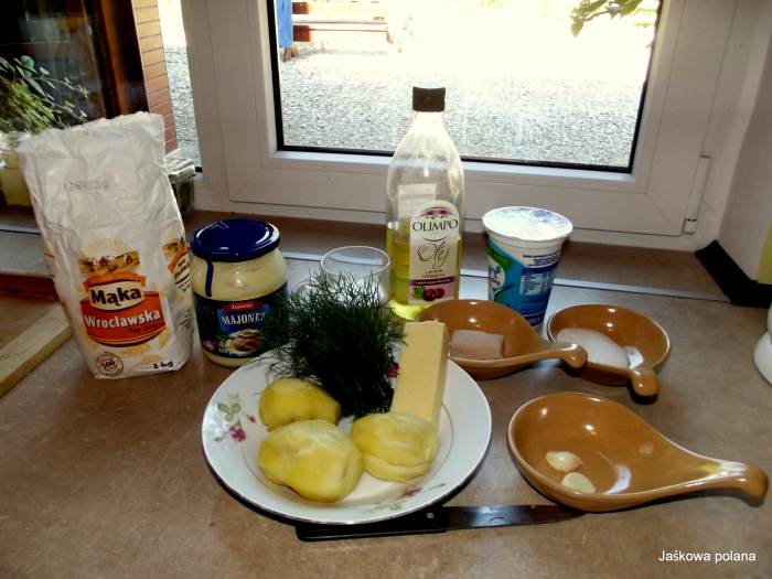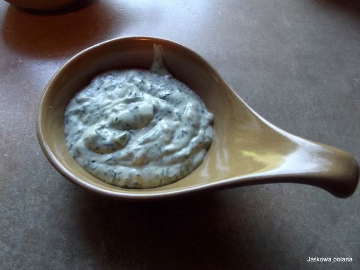 Jogurt wymieszać z majonezem i zmiażdżonym czosnkiem.Dodać koperek.