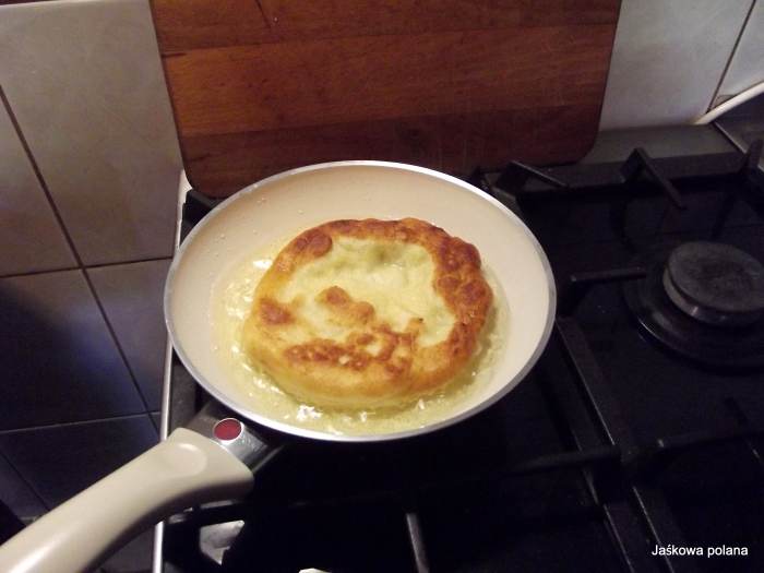 Ciasto podzielić na 8 części i uformować małe placuszki.Smażymy na złoto w głębokim oleju.(langosze powinny pływać) osącz z tłuszczu.