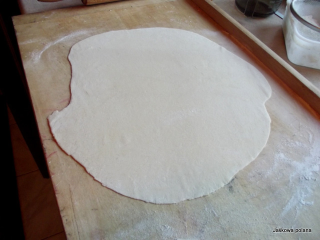 mąka pszenna - dodaję tyle, aby ciasto było sprężyste; po wyrobieniu (początkowo mikserem, potem ręcznie na stolnicy) odkładam na kilkanaście minut przykrywając je miską