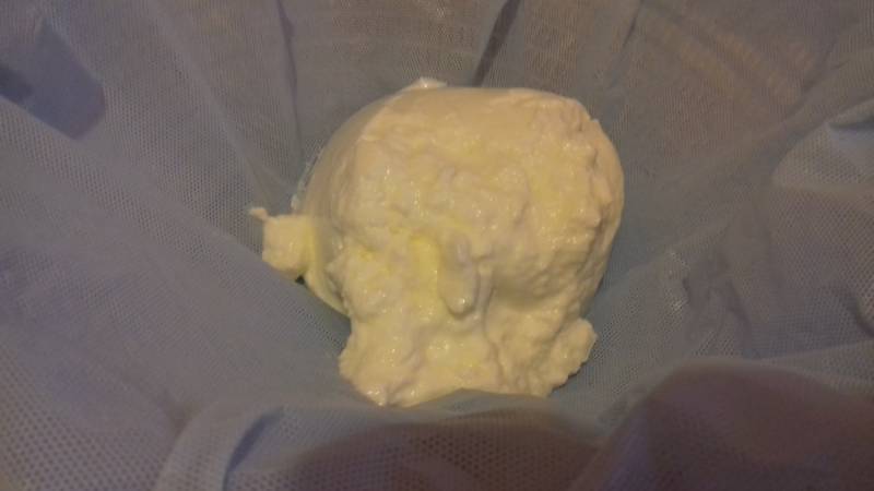 6. Po pierwszym ocieknięciu usunęłam chustę, a serek powędrował bezpośrednio na sitko.