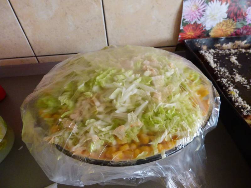 Na to mięso usmażone z kurczaka zimne,sos plus ogórki cebula,kukurydza na wierz trochę sosu i garść kapusty pekińskiej,przykrywamy folią i na 20 minut odstawiamy do lodówki,po tym czasie mieszamy wszystko dokładnie .
