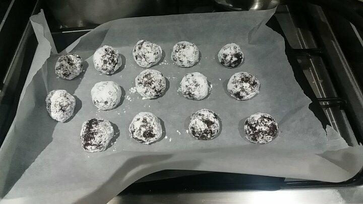 Wymiksować, wsadzić na godzinę do lodówki. Po tym czasie uformowac w reku kulki, wrzucic do miseczki z cukrem pudrem, obtoczyc i układac na blaszce.