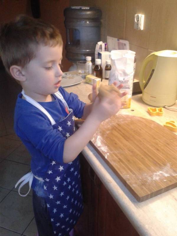 Dzisiaj pokażę Wam jak kolejne pokolenia przygotowują się do świąt. Oto mój 8-my z kolei, 3,5 roczny wnuczek jako najmłodszy master szef junior :diabelek Jedyna pomoc dorosłych to odmierzenie produktów i obsługa piekarnika, reszta to wszystko dzieło Antka.