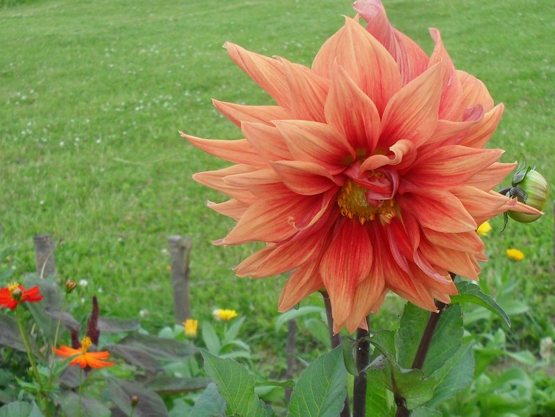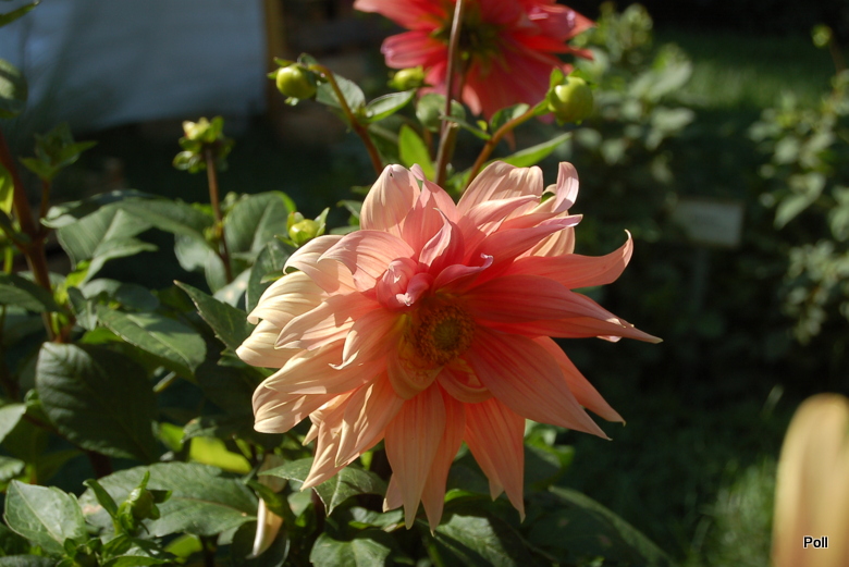 Color Spectacle w OB Dahlem /Berlin / , to jedna z niższych i słabiej kwitnących dalii w porównaniu z innymi odmianami rosnącymi obok