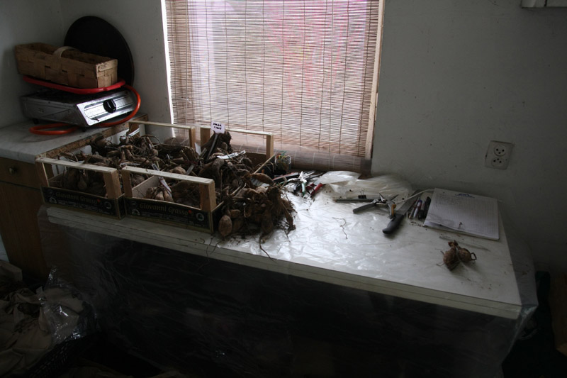 Podzielone dalie przekładam z powrotem do skrzyń, opisane nadmiarowe szykuję do wymian i wysyłek, a te moje czekają cierpliwie w altanie na posadzenie.