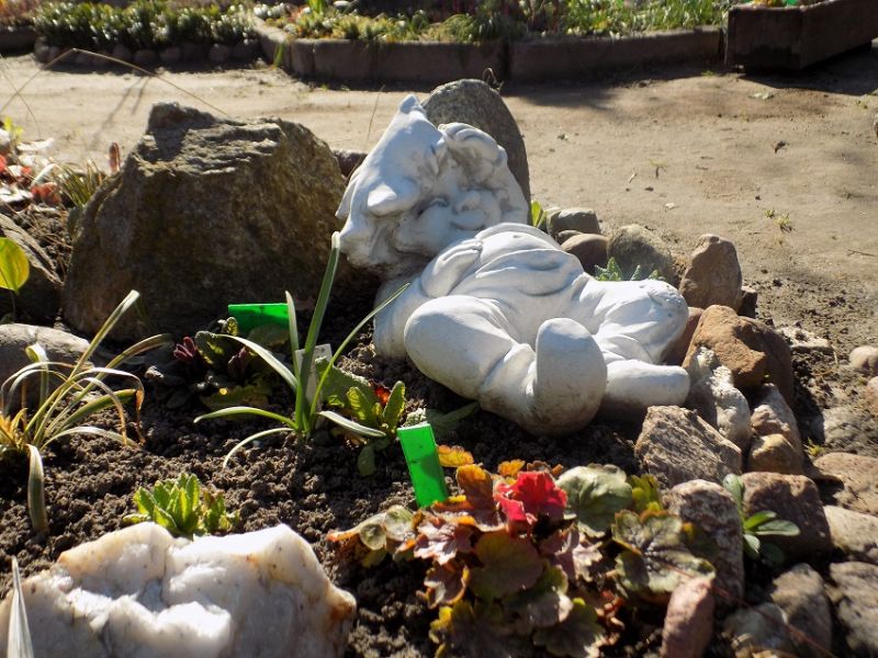Na przykład na kamieniaku leżą betonowe liście z kamiennymi biedronkami.