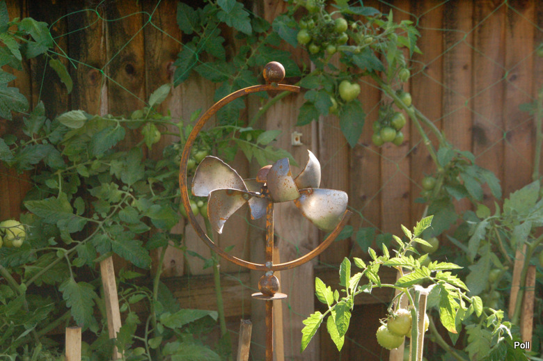 Do moich ozdóbek ogrodowych, których nie mam zbyt wiele, dojdzie wkrótce wiatrak zakupiony na Flower Show. To surowy w formie, z dobrze widocznymi spawami, żeliwno- metalowy gadżecik.