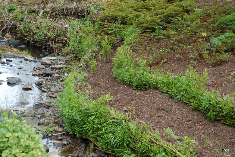 [...] Potok Beck latem jest niewielkim strumieniem, w którego korycie płynie mało wody, ale bywają miesiące, gdy spieniony, rwący nurt podmywa grunt i wylewa się z koryta. Podjęto wiec środki ograniczające ryzyko powodzi m.in zabezpieczono nadrzeczne skarpy wierzbami posadzonymi u podnóża stromych brzegów . Są one uplecione na kształt płotka w stylu 'Basketweave', czyli tradycyjnej techniki ‘willow spilling’. Polega ona na przetykaniu mijankowo (podobnie, jak tkanina) sadzonek wierzby, które korzenią się umacniając grunt. Co sezon wierzby są przycinane, by zbyt nie wybujały i nie zasłaniały innych roślin. Jest to tradycyjny i zarazem bardzo skuteczny sposób zapobiegania erozji gruntu podczas gwałtownych powodzi. Latem wierzby te nie są widoczne, ale na jednym ze zdjęć majowych widać, jak wierzbowe płotki zaczynają się zielenić..