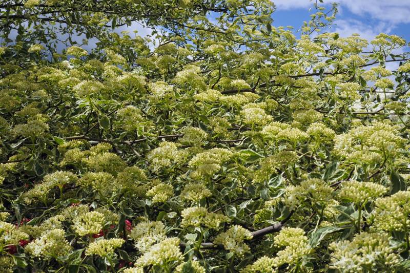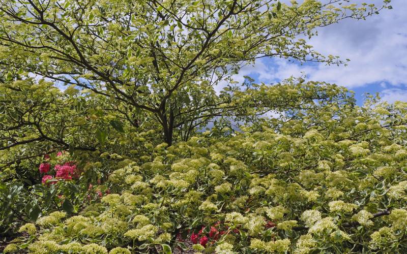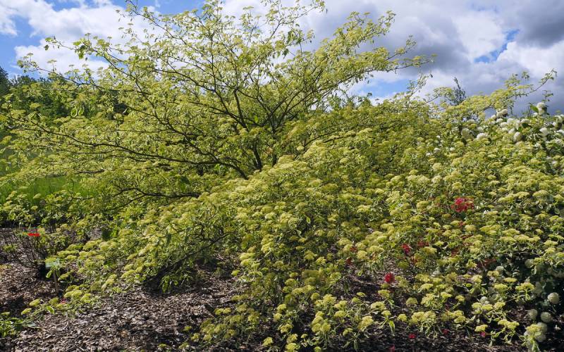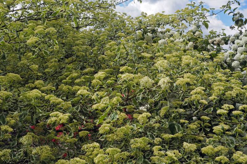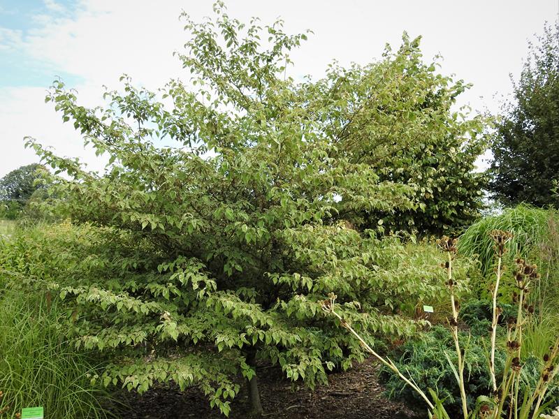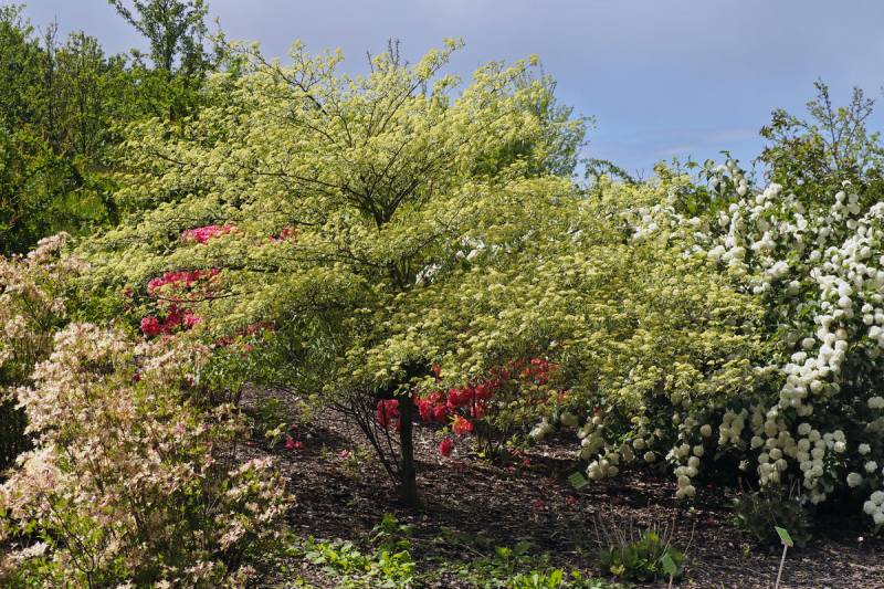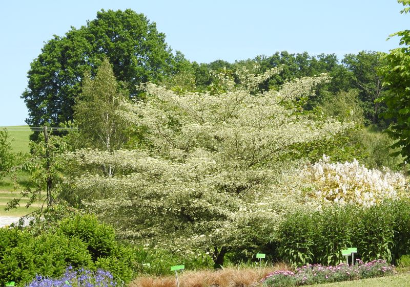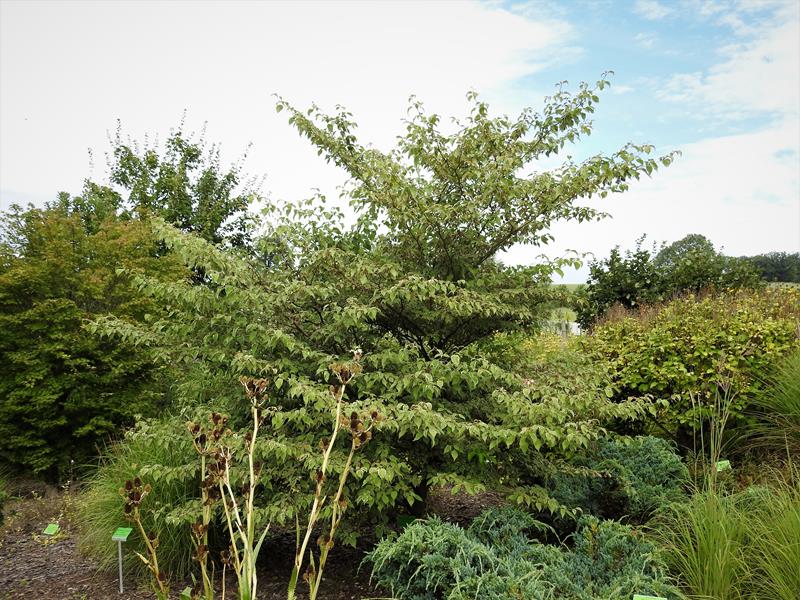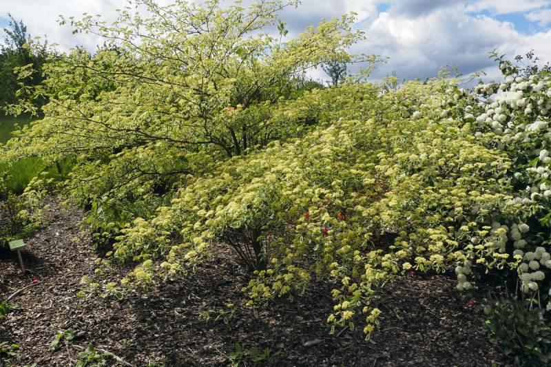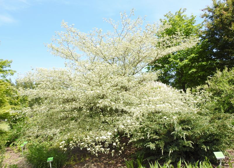 Niezbyt duże drzewo dorastające do 4 m. wysokości. Pokrój: wzniesiony, szeroko kolumnowy. Gałęzie: poziomo rozpostarte, wyrastają z pnia piętrami. Liście: szaro-zielone z wąską, białą lub biało-różową obwódką. Kwiaty: białe, drobne, zebrane w baldachogrona, pojawiają się na przełomie maja i czerwca. Stanowisko: najlepiej półcieniste, gdyż w pełnym słońcu mogą przypalać się białe fragmenty liści. Gleba: żyzna, próchnicza, umiarkowanie wilgotna, kwaśna lub lekko kwaśna.