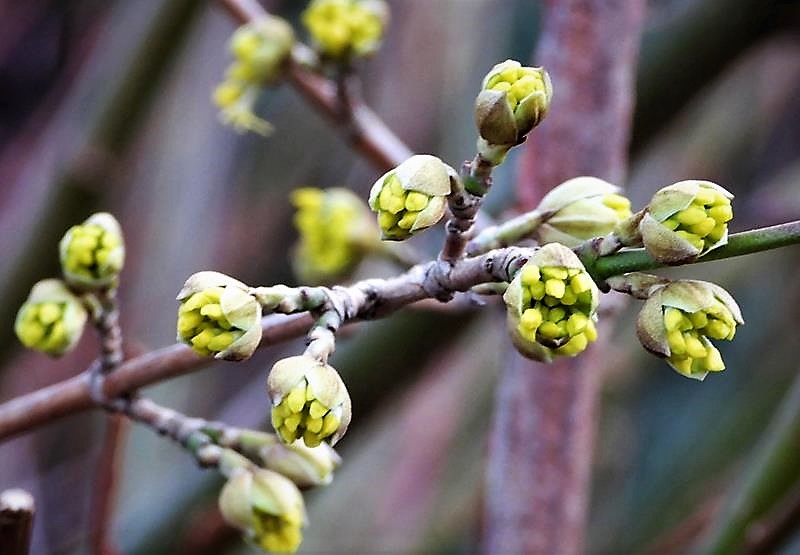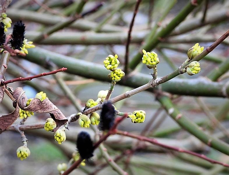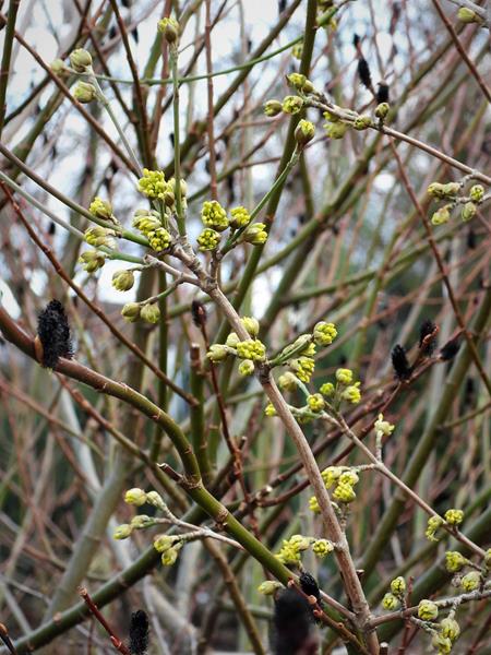 Kwiaty: drobne, żółte, z wystającymi pręcikami, skupione po kilka sztuk w główkowate kwiatostany, pojawiają się przed rozwojem liści.