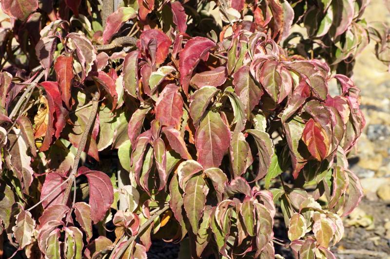 Liście: jasnozielony z kremowobiałym, nieregularnym marginesem oraz z plamkami koloru na całym liściu, jesienią przebarwia się w odcieniach różu i czerwieni.