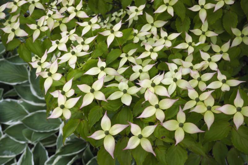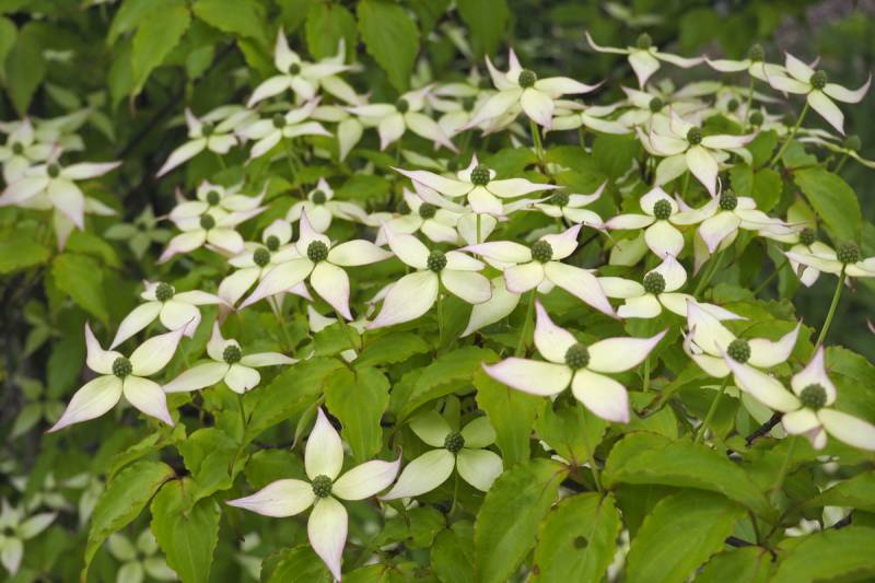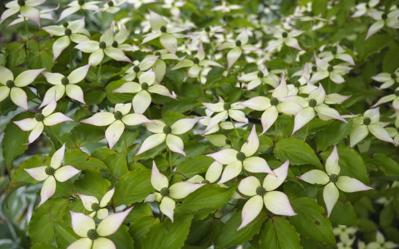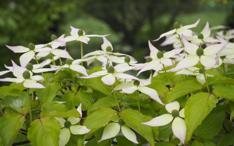 Kwiaty: małe, zielonkawe w zbitych główkach; dekoracyjne są kremowobiałe podsadki kwiatowe, duże i spiczaste, po 4 pod każdym kwiatostanem, zakwita bardzo obficie w czerwcu