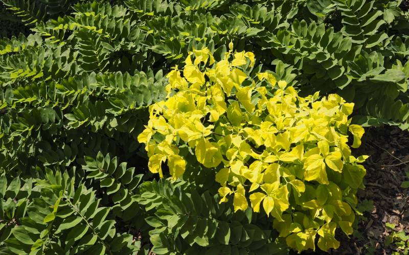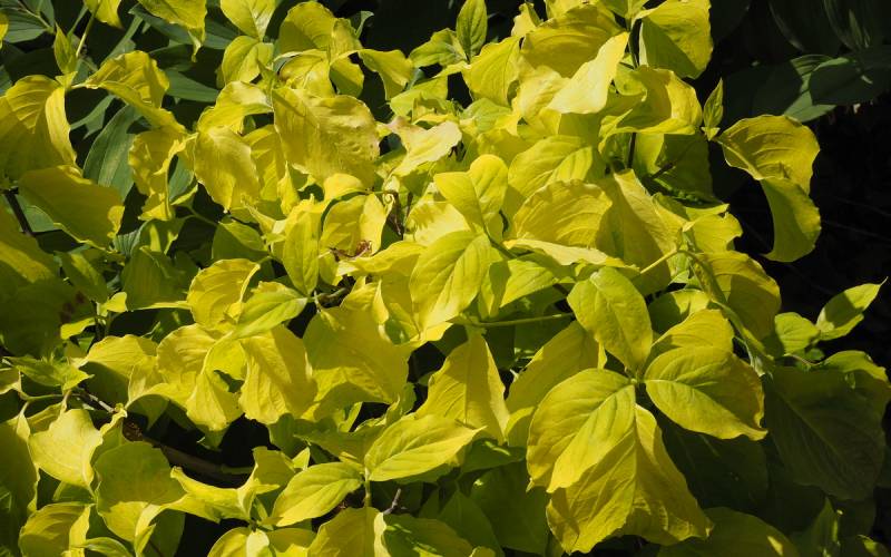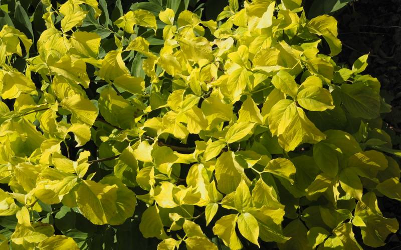 Liście: żółte, niekiedy z zielonym rysunkiem na środku blaszki liściowej, ok. 10 cm długości, jesienią przebarwiają się na pomarańczowo-czerwono