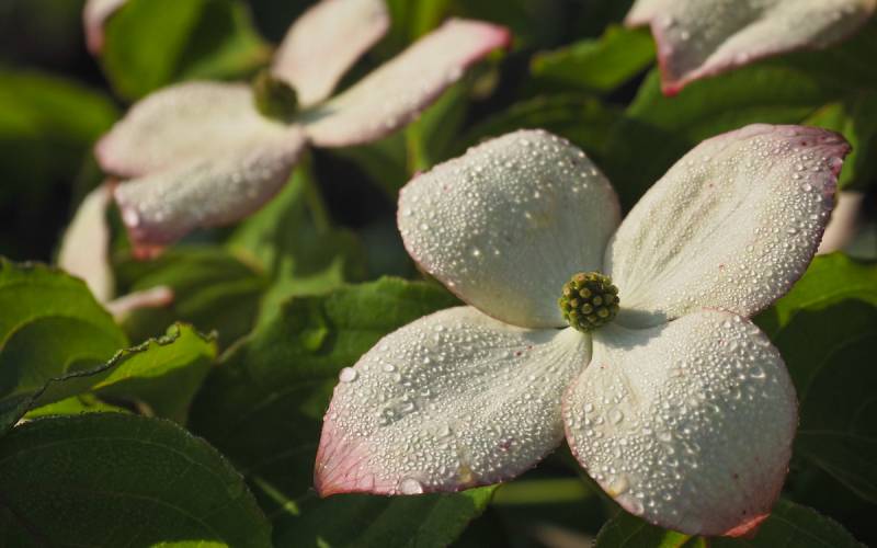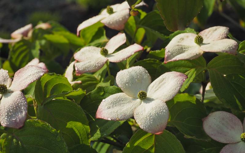 Cornus kousa 'Satomi' rozwija kwiaty, teraz czekamy na ich wybarwienie