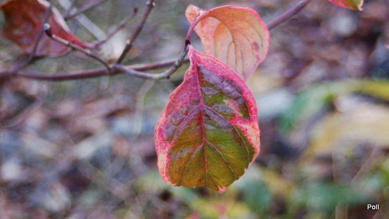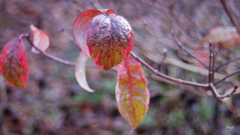 Dereń kwiecisty 'Cherokee Chief' zgubił już niemal wszystkie liście. Szkoda, bo wybarwiają się bardzo ciekawie.