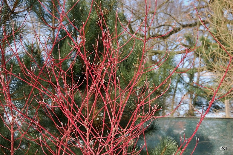 Pędy: młode są jaskrawoczerwone, starsze bledną. Bezlistne, mocno wybarwione pędy są niewątpliwą zimową ozdobą.