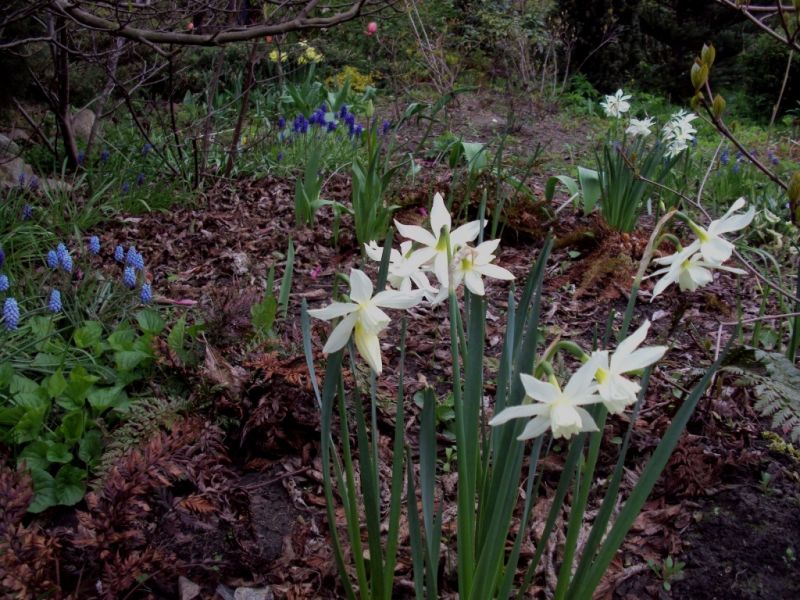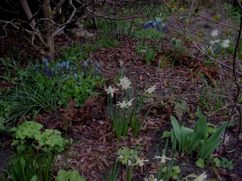 Cebule drobnych roślin możemy sadzić dość blisko drzew, wtedy kiedy one potrzebują mniej wilgoci drzewa potrzebują jej więcej (znaczy robią za odsysacze). No ale nie tylko bardzo wczesne cebulowe można na takiej cienistej rabacie sadzić.