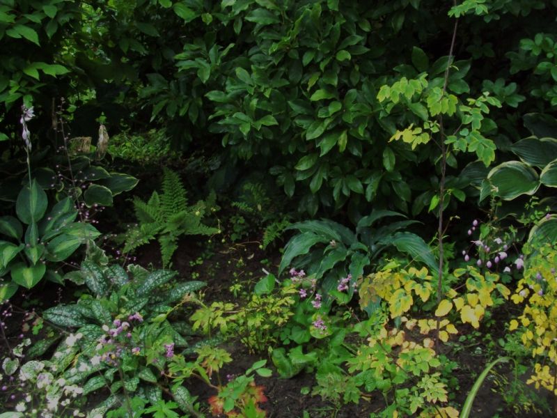 Tojeść kropkowana i orszelinowa. Nie wiem, czy jest to efekt podłoża (lekko kwaśne), czy cienia, ale obie nie wykazują nadmiernych tendencji do zbytniego rozprzestrzeniania się.