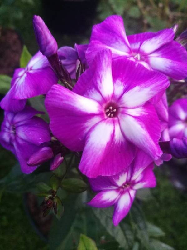 Kwiaty fioletowo-purpurowe z duży białym oczkiem, pachnące do 4,5cm średnicy. Kwiatostany do 20cm. Kwiaty nie blakną w słońcu i nie zmieniają koloru wieczorem.