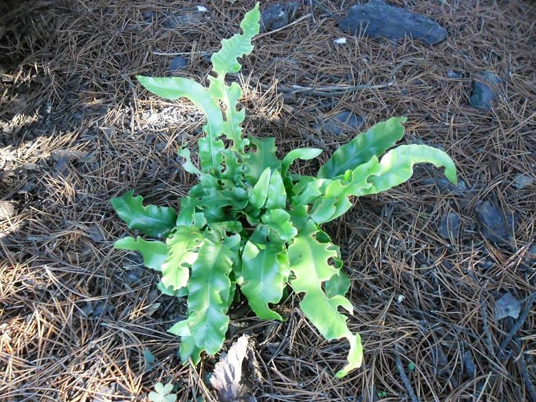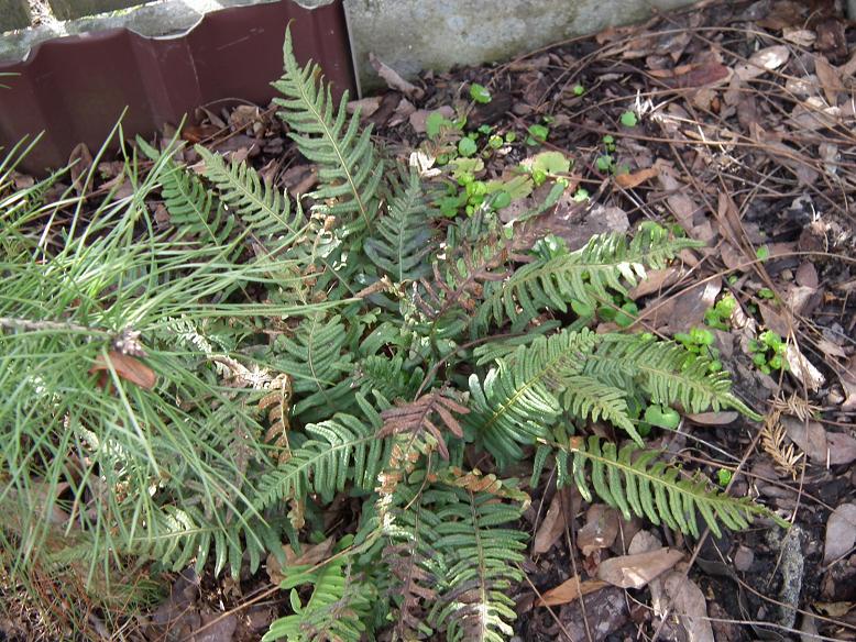 Dziś sprawdziłam, jak przezimował jeden z języczników - siewka/freak Asplenium scolopendrium, który dostałam 4 lata temu od Tomasza. ta paproć nie była przykryta gałęziami iglastymi a ściętymi jesienią pędami miskantów. Póki co, optymistycznie clap