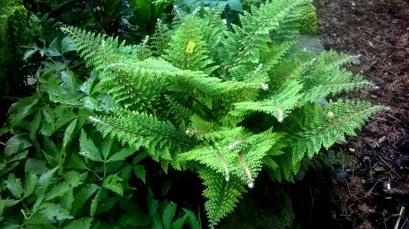 Młody, bo drugi sezon w moim ogrodzie, Dryopteris uniformis. Gdy dojrzeje, rozszczepione końcówki liści będą lepiej widoczne