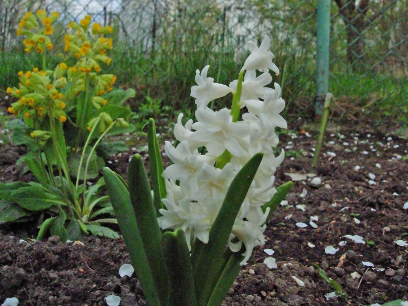 Na balkonie jest cieplej niż w ogrodzie, więc wszystko zakwita wcześniej. Zaczynają mi kwitnąć Hiacynty, białego kupiłem kilka lat temu jako 'Madame Sophie' i był to Hiacynt pełny, jednak z każdym kolejnym rokiem coraz mniej kwiatów jest pełne, a coraz więcej jest pojedyncze. Ciekawe dlaczego think: