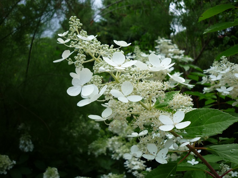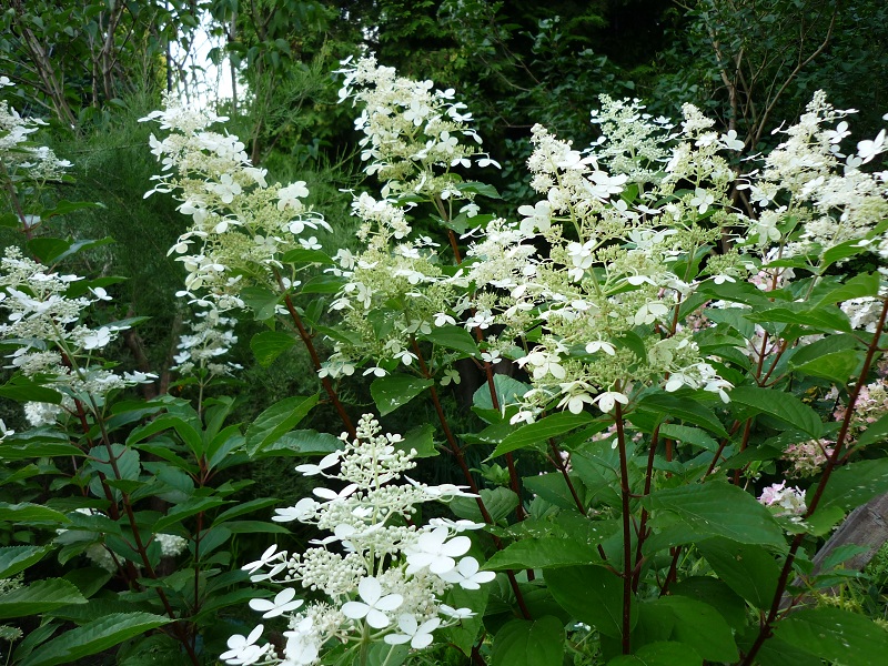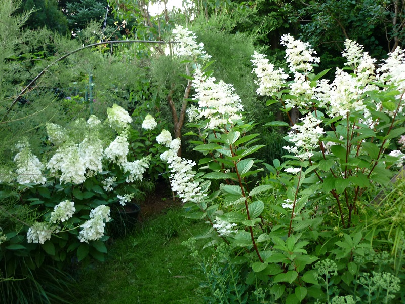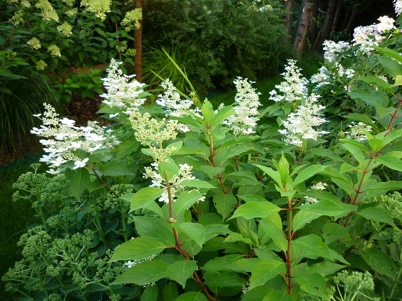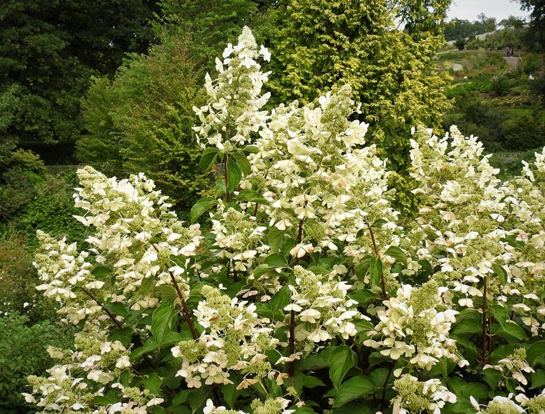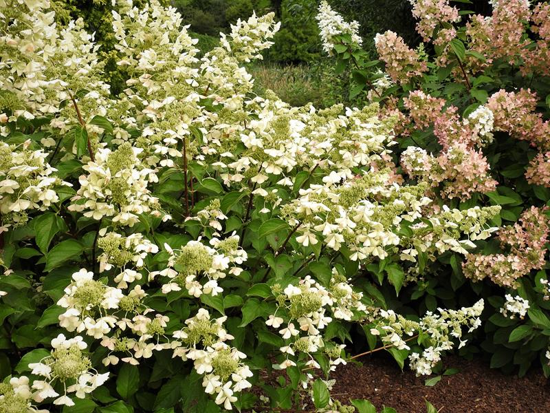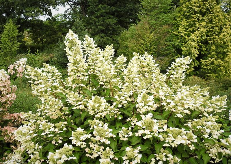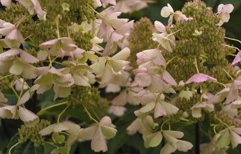 Dziś już wszystkie hortensje bukietowe mają brązowe kwiatostany, tylko 'Pink Lady' wyróżnia się bardzo jasnym kolorem kwiatów płonnych.