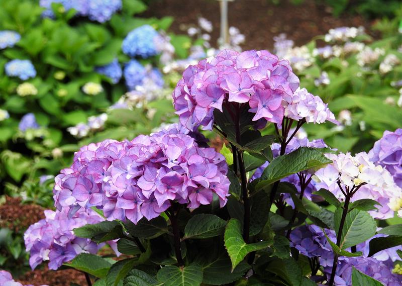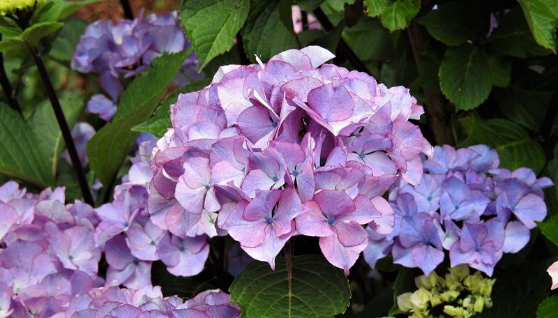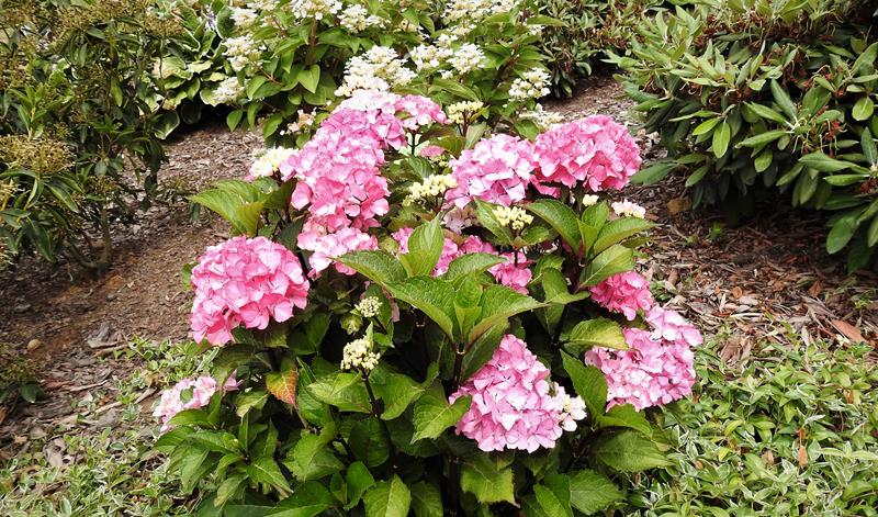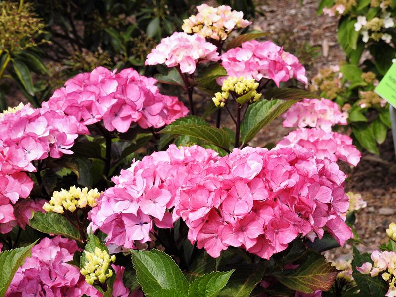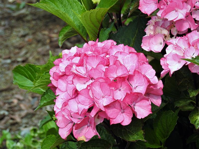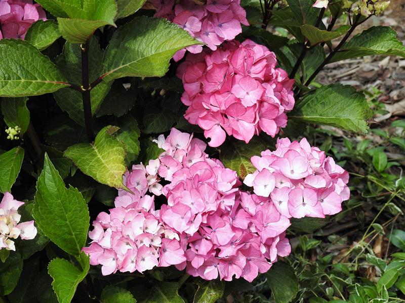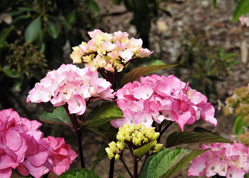 Hortensja zachwycająca ciemnymi łodygami, które bardzo ładnie kontrastują z dużymi różowymi kwiatami.