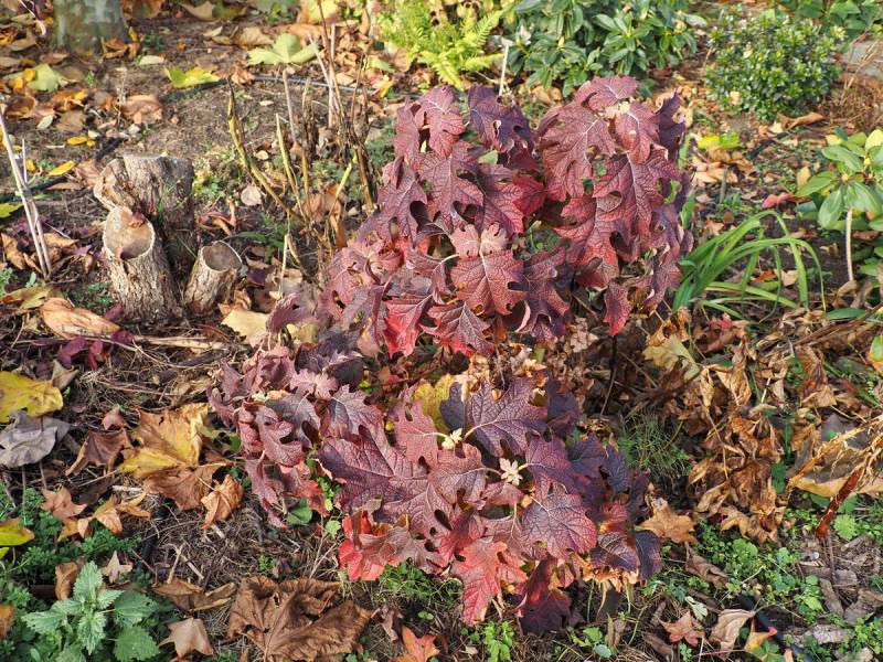Liście: silnie powcinane, od spodu pokryte filcem, z początku ciemnozielone, jesienią przebarwiają się na intensywnie czerwony kolor;