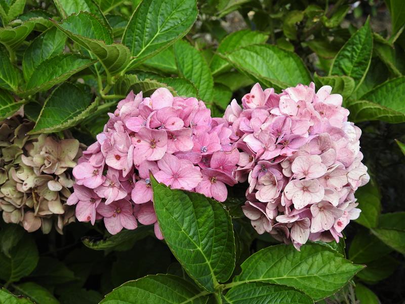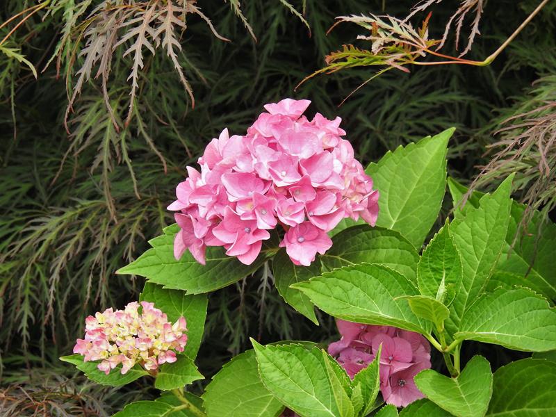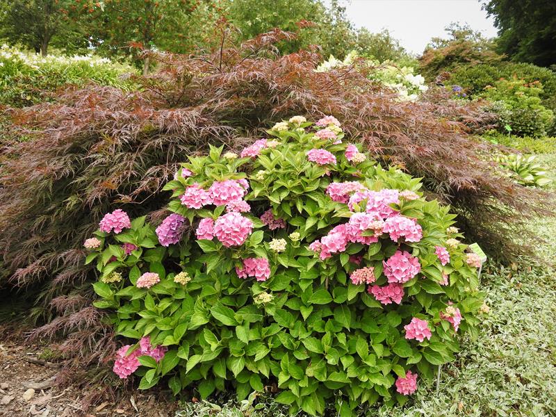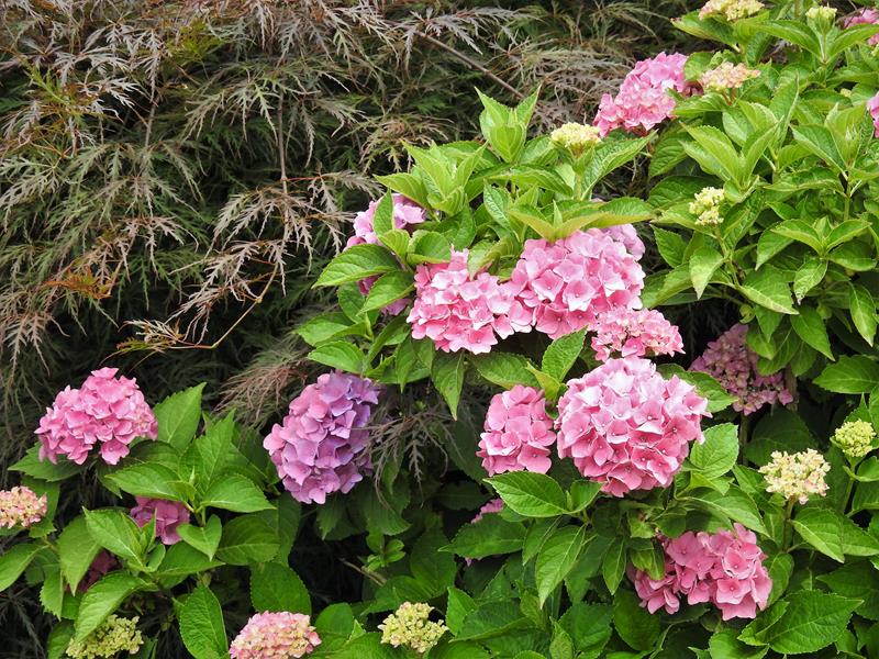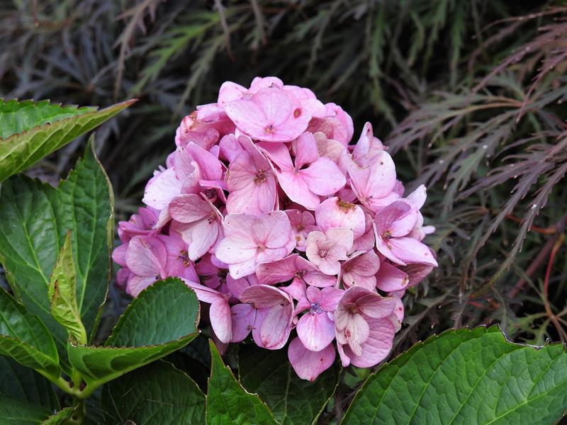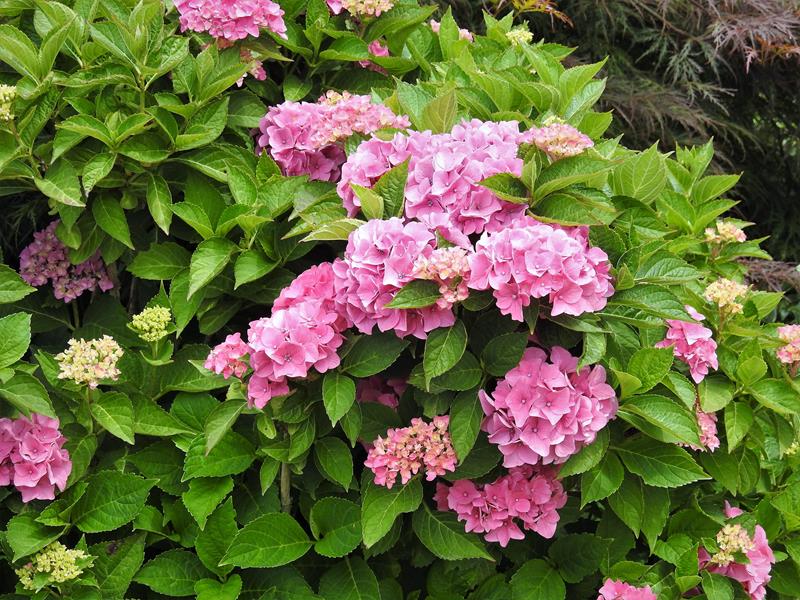 Wysokość: dorasta 140-160 cm Kwiatostany: duże, kuliste w różowym lub w niebiesko-fioletowym kolorze w zależności od pH gleby. Kwitnienie: od lipca do września Stanowisko: zalecane półcieniste, ale egzemplarz ze zdjęć rósł na słonecznym. Gleba: przepuszczalna, wilgotna, żyzna, najlepiej o odczynie kwaśnym 4-5 pH