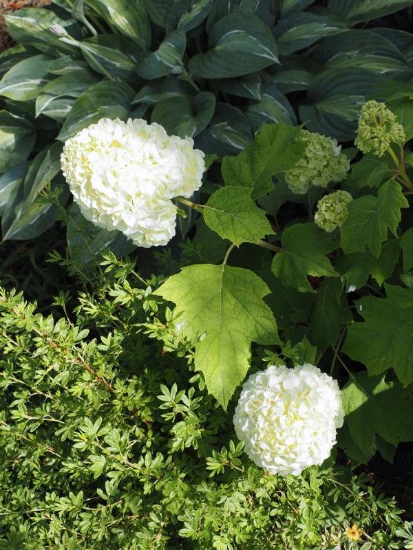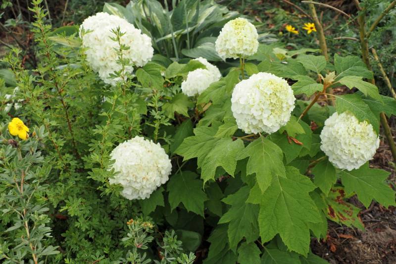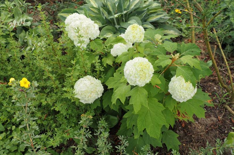 Liście: grube, powcinane, od spodu pokryte filcem, tworzą gęsty, efektowny krzew nawet wtedy, gdy nie kwitnie, jesienią ładnie się przebarwiają