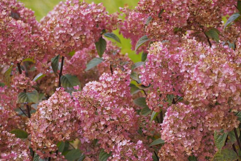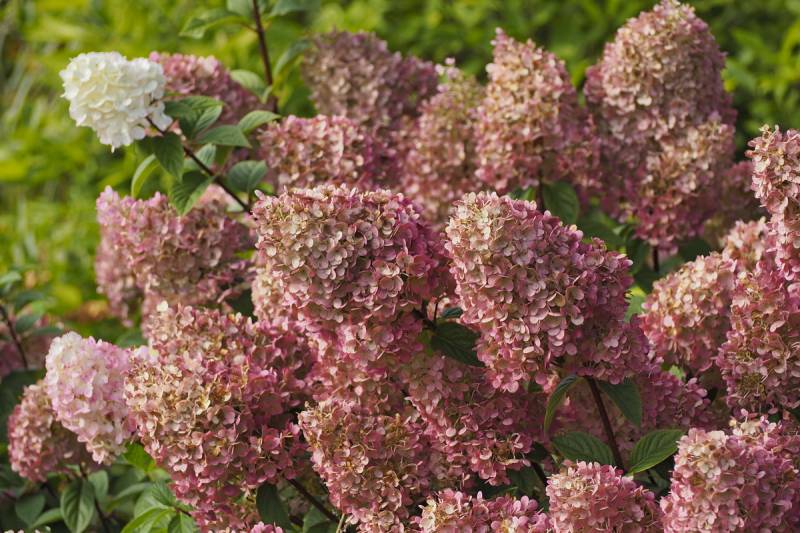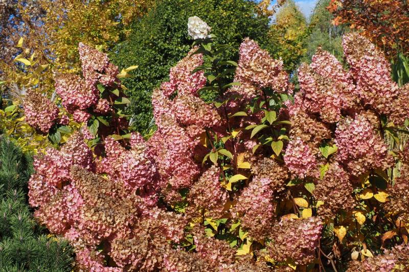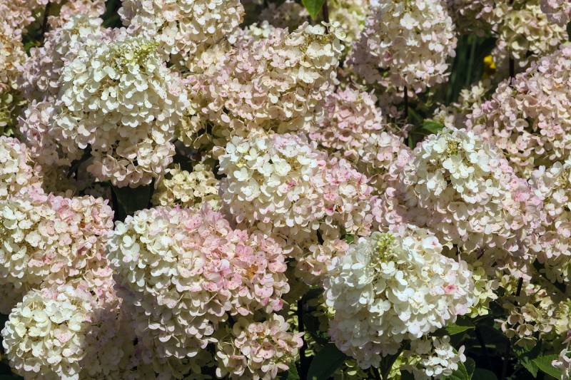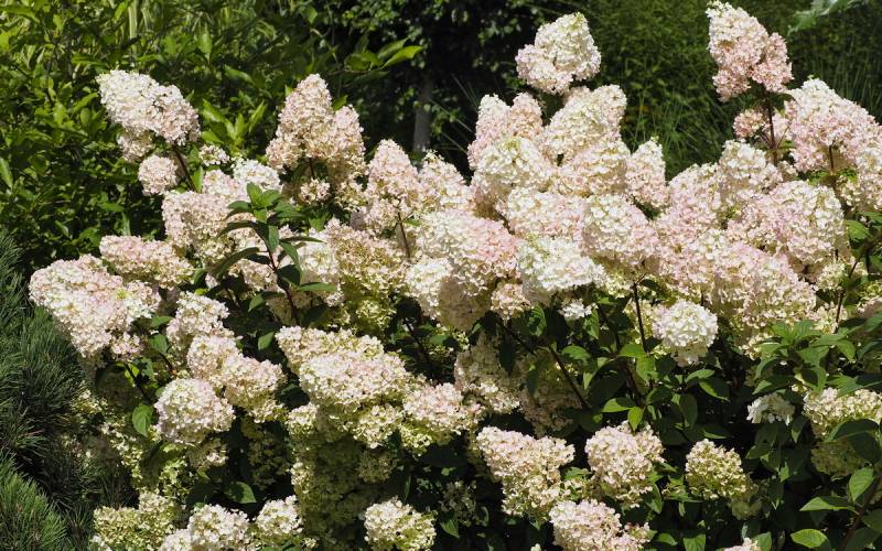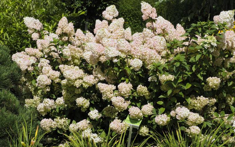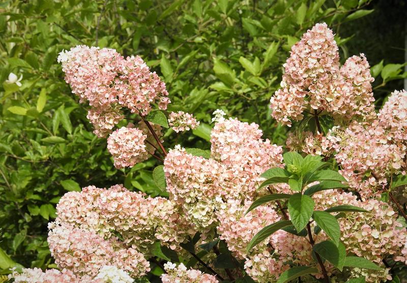Kwiaty : kwitnie od lipca na pędach jednorocznych. Kwiatostany z przewagą dekoracyjnych kwiatów płonnych, białozielone, początkowo z różowym środkiem, z czasem różowieją.