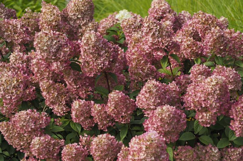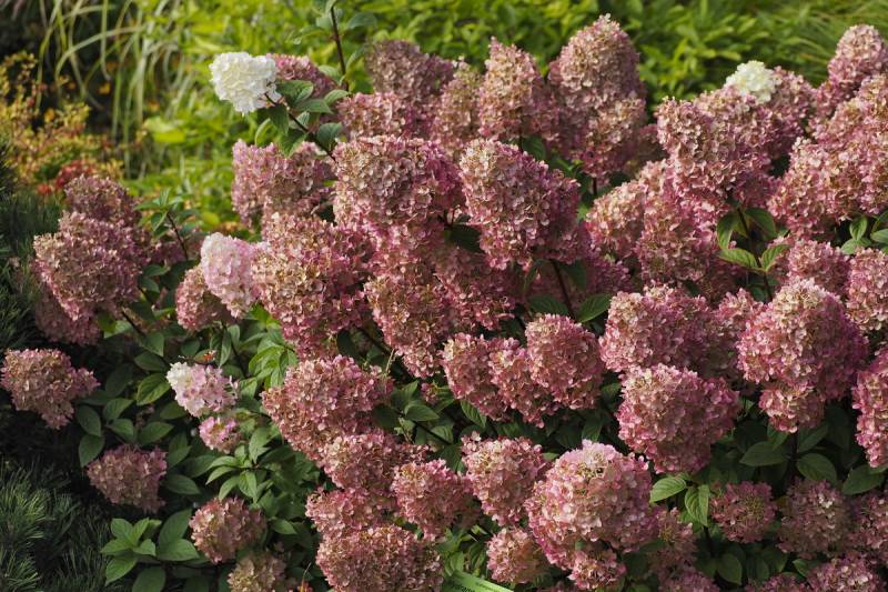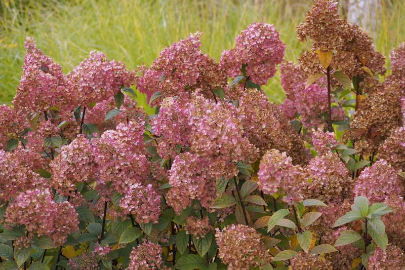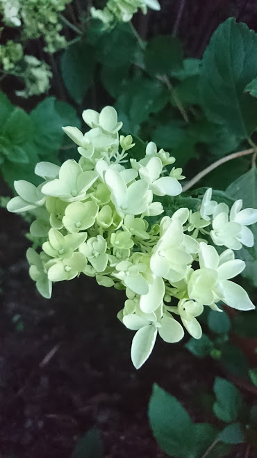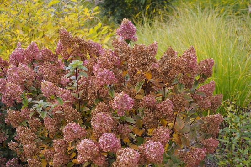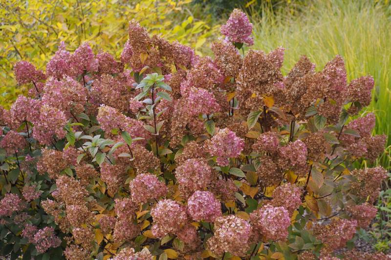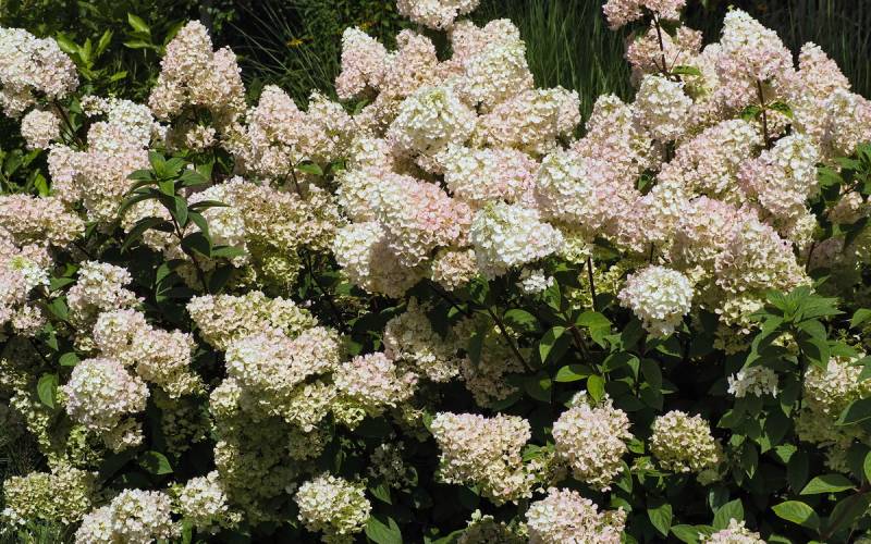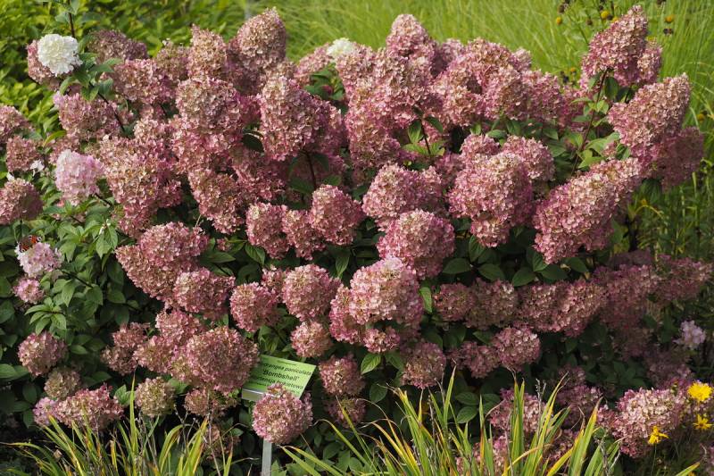 Kwiaty : kwitnie od lipca na pędach jednorocznych. Kwiatostany z przewagą dekoracyjnych kwiatów płonnych, białozielone, początkowo z różowym środkiem, z czasem różowieją.