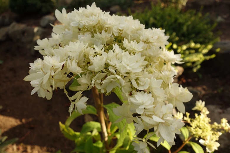 Kwiaty: kwitnie od czerwca do września na pędach jednorocznych. Wiechy składające się z gwiazdowatych, podwójnych kwiatków, z których środka stale wyrastają nowe kwiatki. Kolor kwiatów od zielonkawego do białego. Niestety roślina mocno się pokłada, szczególnie w młodym wieku.