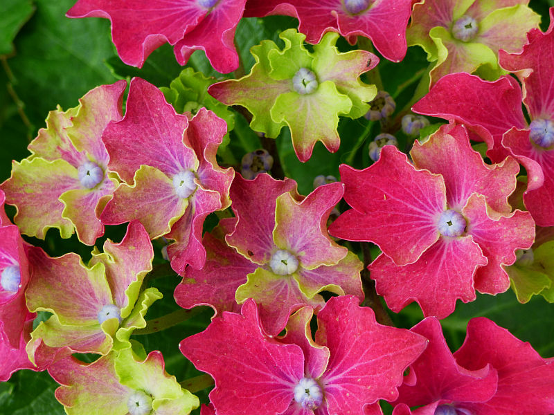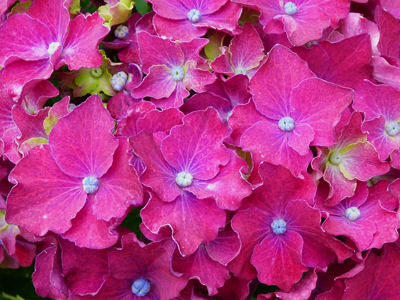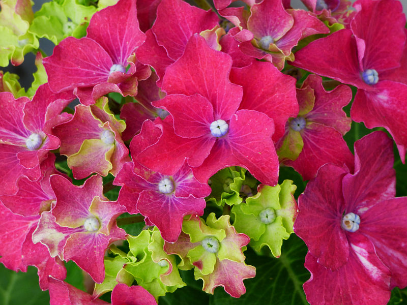 Kwiaty: nietypowe, bo zbudowane z płatków o falistych brzegach - wyglądają jakby były postrzępione - skupionych wokół wypukłego, niebieskiego oczka... zebrane w duże, różowe lub fioletowo niebieskie (w zależności od pH podłoża) kwiatostany o wielkości około 20-25 cm... kwitną od czerwca do września