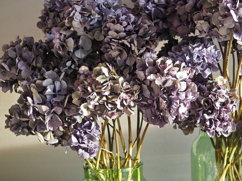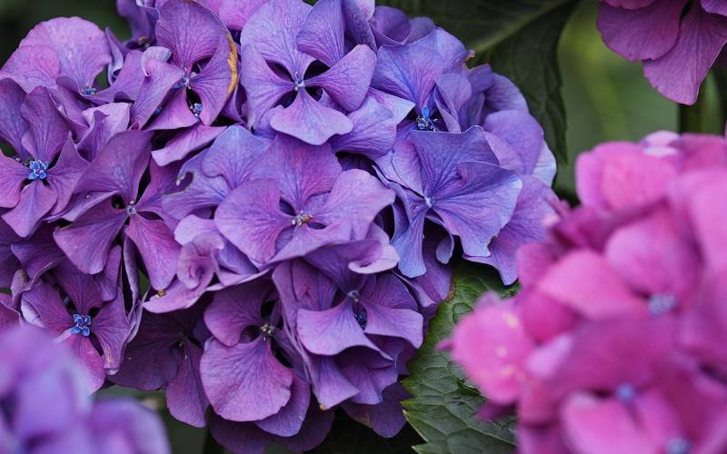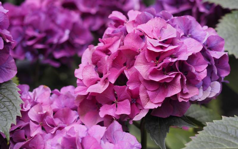 Kwiaty: żywo różowe prawie czerwone (mogą być fioletowe w bardziej kwaśnej glebie) zebrane w duże kuliste kwiatostany o wielkości 25-30 cm; kwitnie na pędach dwuletnich od czerwca do września