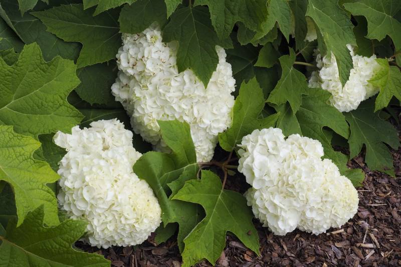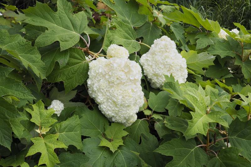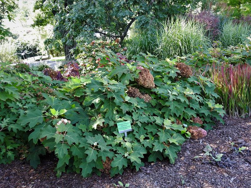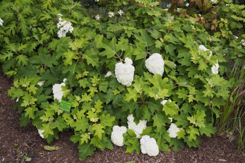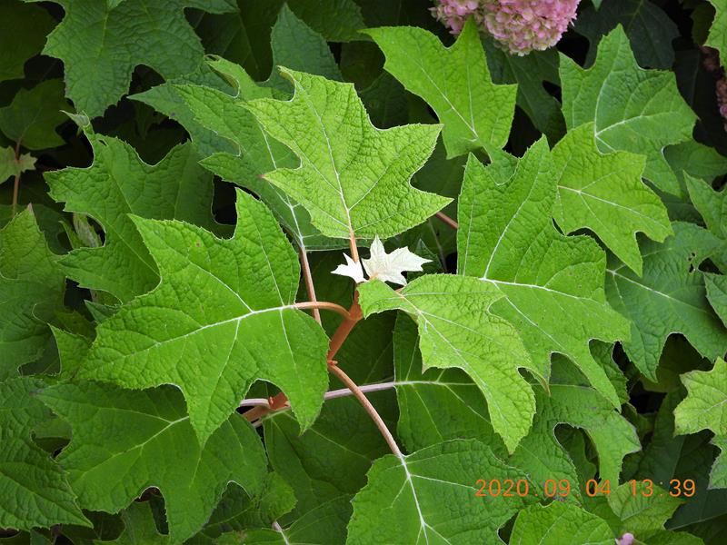 Liście: duże, skórzaste, podobne w kształcie do liści dębu czerwonego, jesienią przebarwiają się na czerwono-pomarańczowo i fioletowo-brązowo, bardzo długo utrzymują się na krzewie, nawet do początku zimy