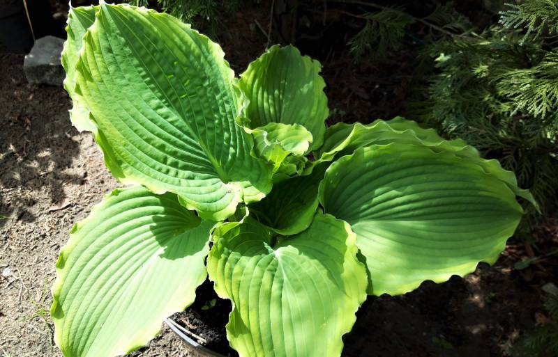Hosta Rock Island Line podzielona wiosna ubiegłego roku czeka na przesadzenie