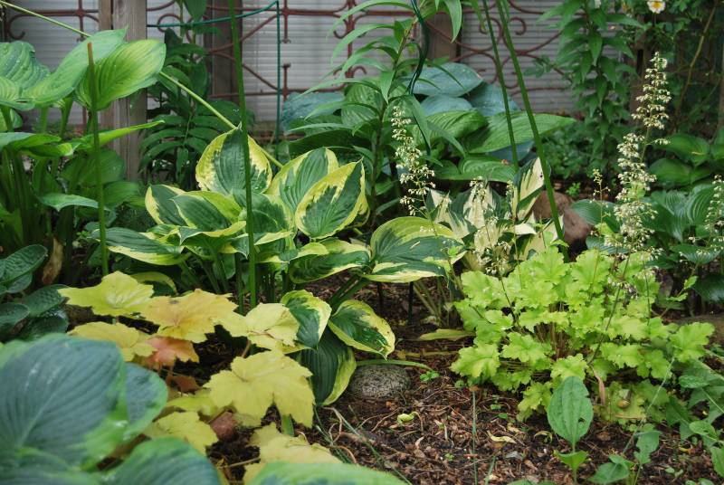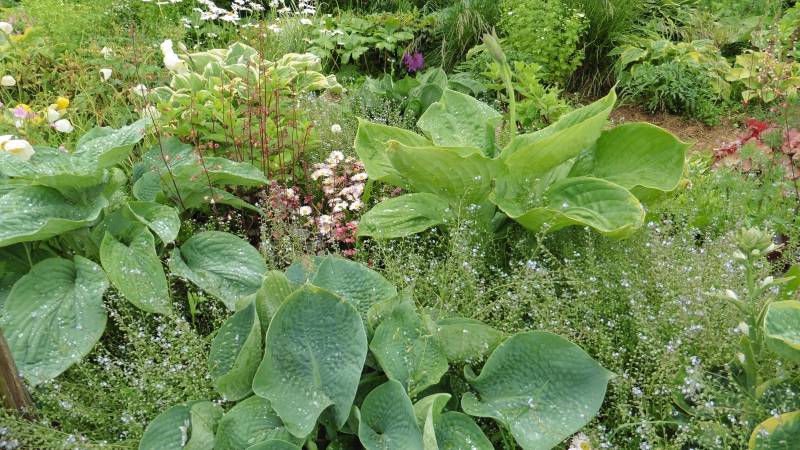 Jeszcze znalazłam taki czerwcowy widoczek ogólny na inny zakątek hostowy. Na pierwszym planie nn - może to Abiqua Moonbeam ? :nie_wiem