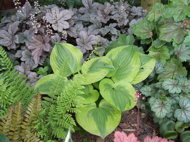Hosta Mississippi Delta w towarzystwie paproci , żurawki...