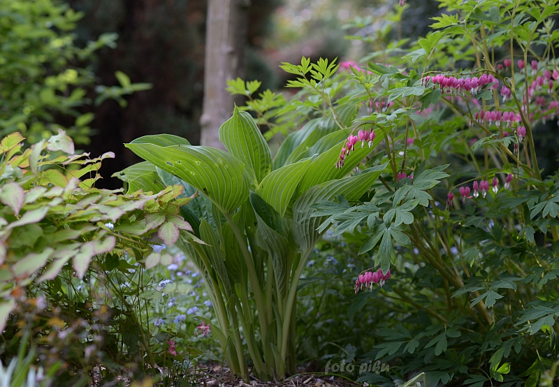 Hosta 'Empress Wu' w towarzystwie serduszki, epimedium i niezapominajek :)