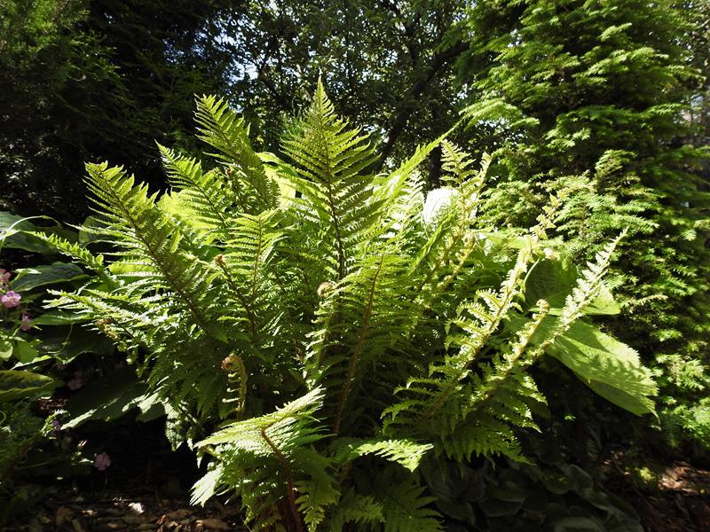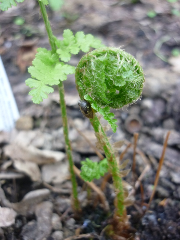 Dryopteris filix-mas 'Barnes' powoli rozwija pastorały na szybko nagrzewającym się stanowisku