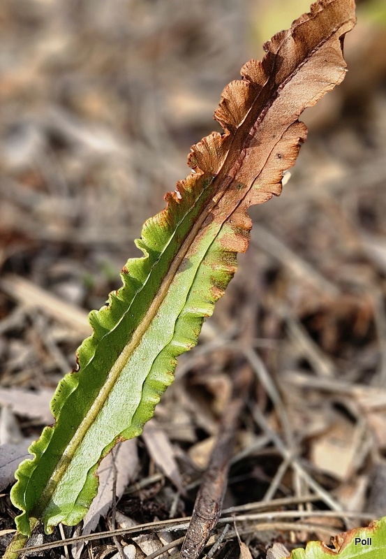 Wszystkie liście Asplenium scolopendrium 'Supralineatum' po zimie wyglądają tak, jak na poniższym zdjęciu... Był przesadzany jesienią, więc okryłam go dwoma małymi sosnowymi gałęziami.