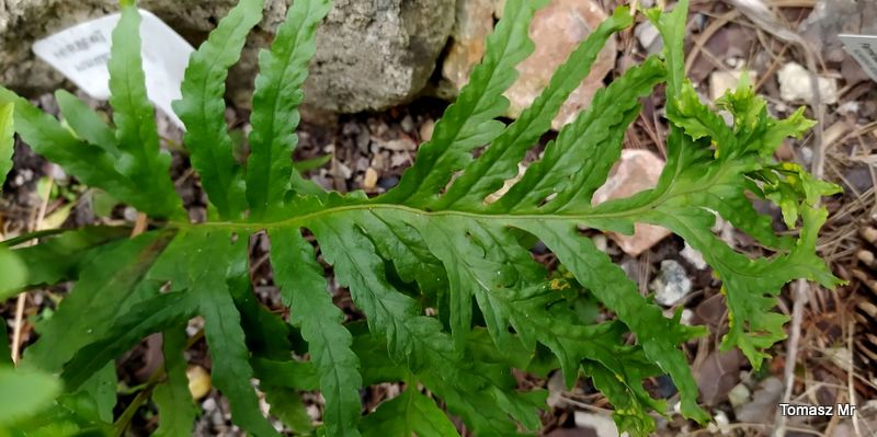 Polypodium cambricum "Herbert Whitley, paprotka kupiona w jednej z renomowanych szkółek w Wielkiej Brytanii. Jej pierwsze liście były proste i przypominały raczej gatunek- jeden z nich widać po prawej stronie. Były bardzo nietrwałe, łatwo się wyłamywały.. Pod jesień pojawiły się nowe, bardziej ozdobne. Nie do końca jednak przypominają liście, jakie zobaczyłam na zdjęciach tej szkółki.