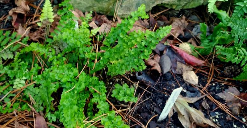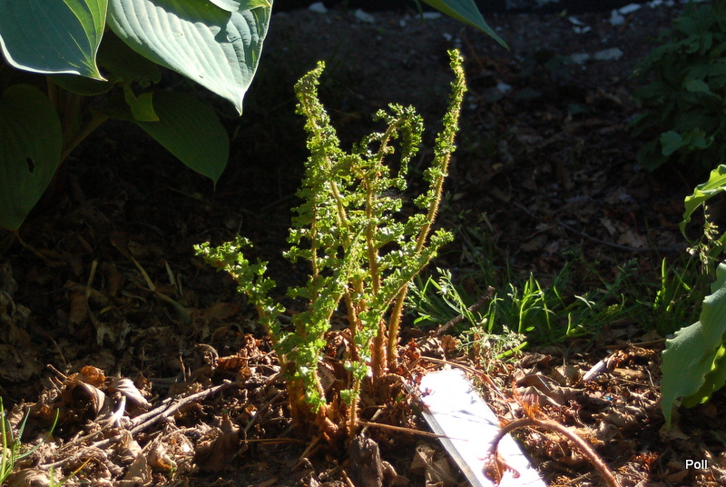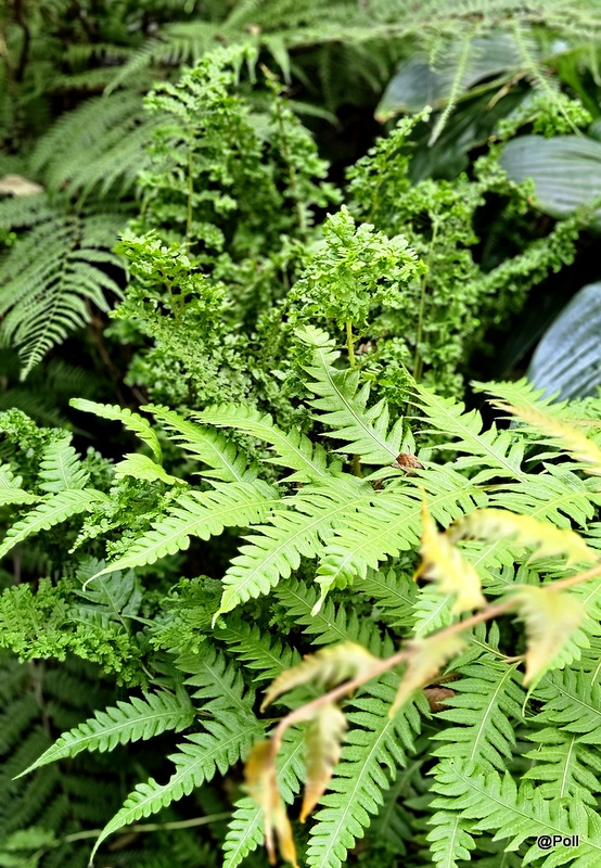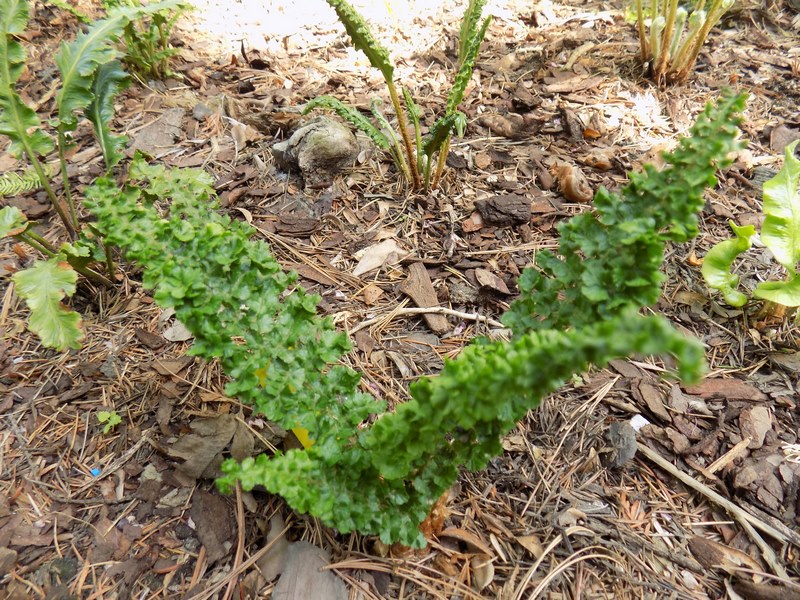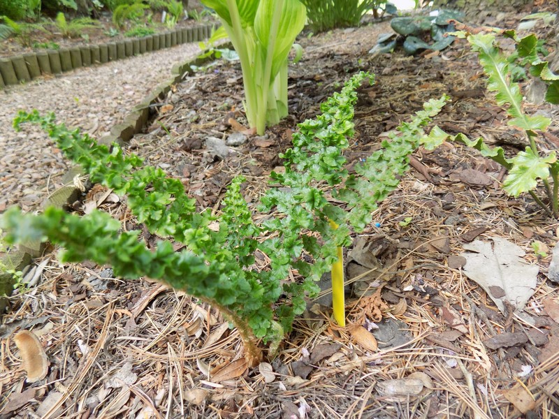 Rosnąca obok Dryopteris filix-mas 'Lloydii', Woodwardia unigemmata tak się rozrosła,, że obu kęp niemal nie było widać. Wykopałam jedną, podzieliłam i przesadziłam na stanowisko w innej części ogrodu. Druga została na dawnym miejscu i widać tylko jej górną część: