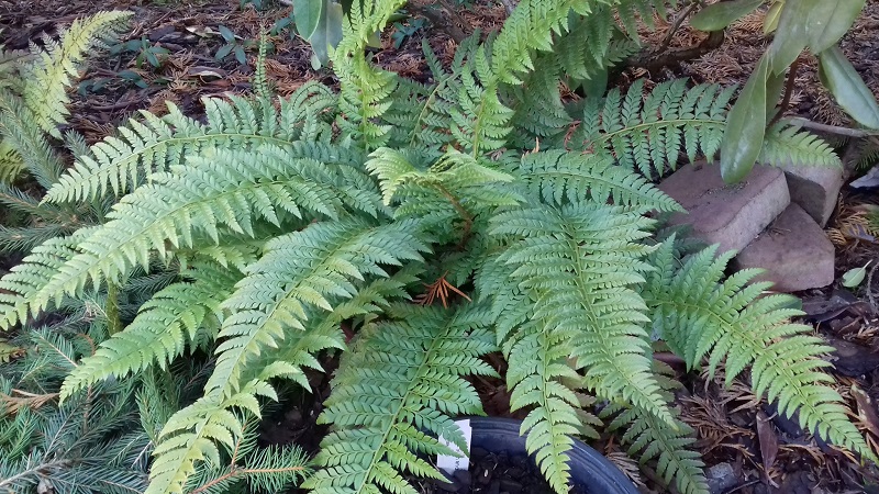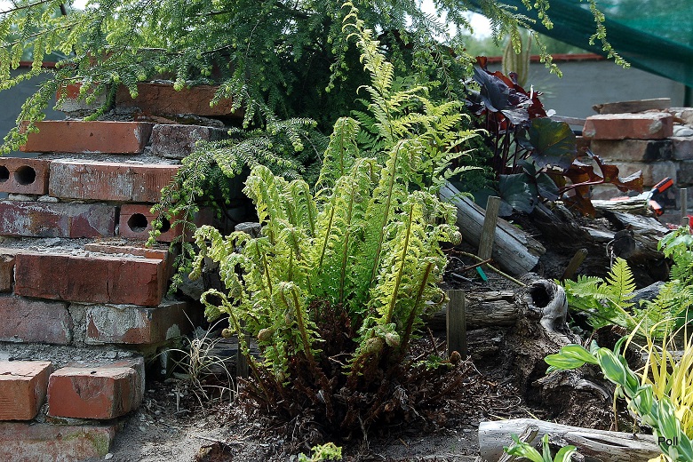 Jeden z moich dwóch Polystichum acueatum/i] rozwija się na ceglanym stoku. Póki co, jeszcze w pełnym słońcu