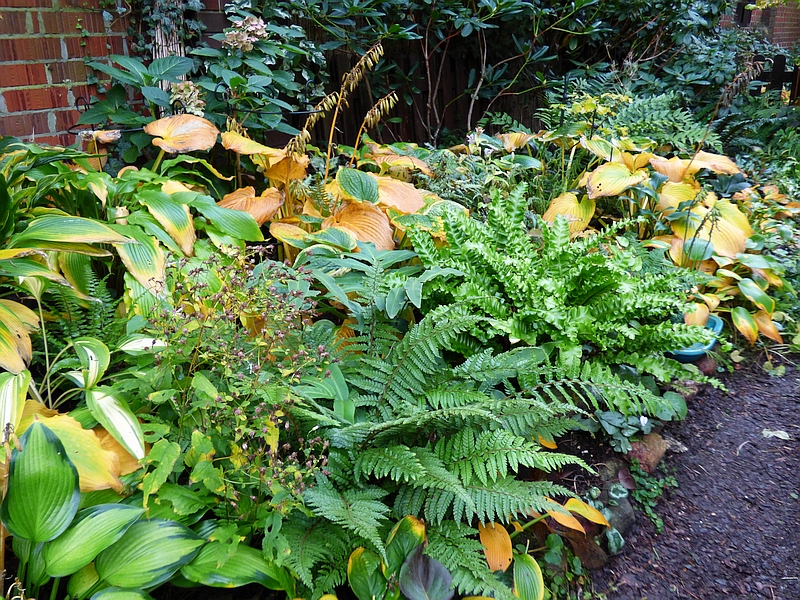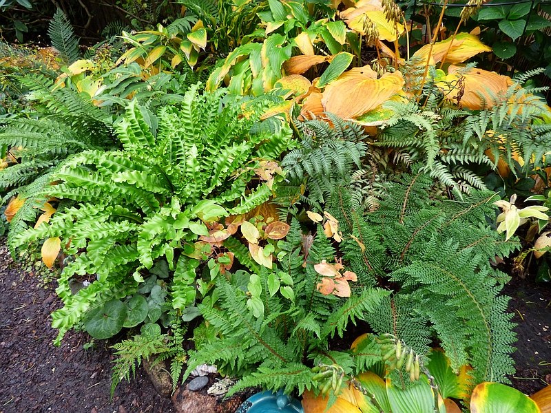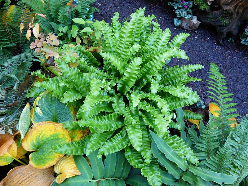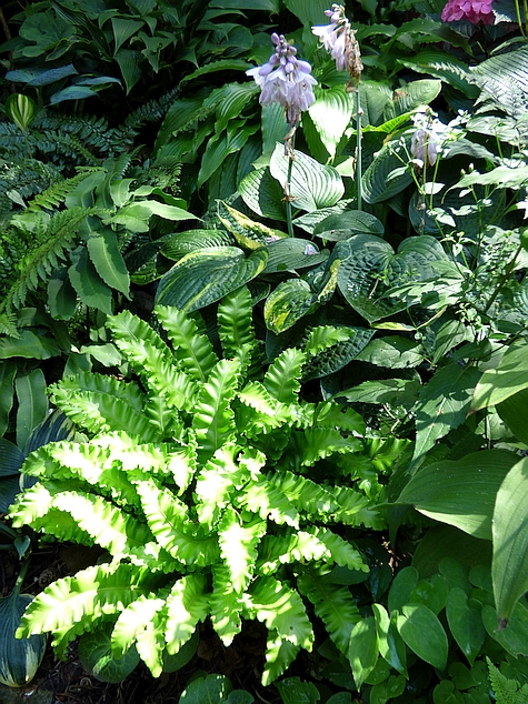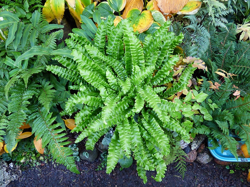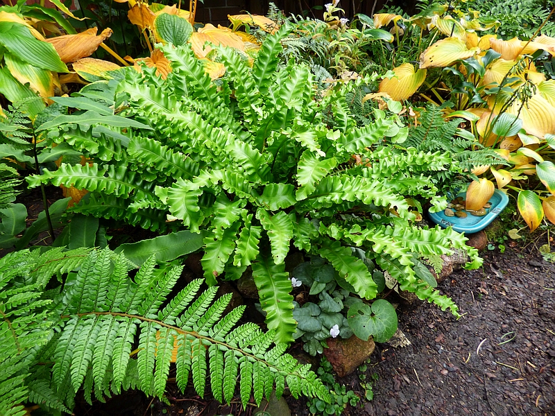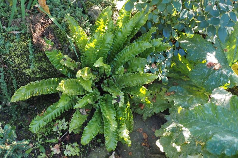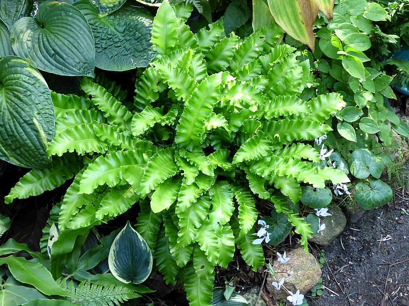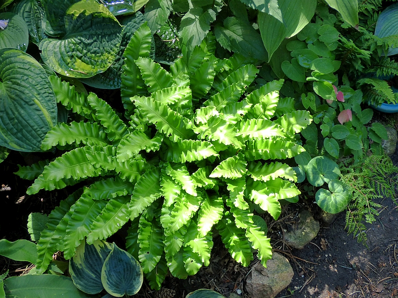 Leśny egzemplarz Asplenium scolopendrium Crispa, który wcześniej miał długaśne łodygi i liście, w tym roku jakby bardziej przyziemny, co nie znaczy, że nie jest śliczny.